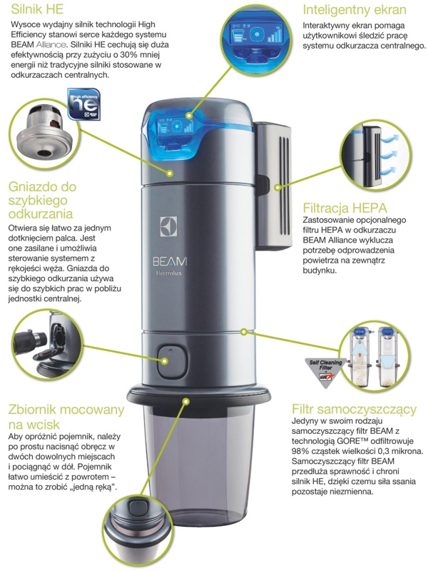 Ta nowa jednostka centralna BEAM ALLIANCE zapewnia optymalną wydajność czyszczenia i innowacyjne rozwiązania z całą doskonałością techniczną poprzedniej serii Platinum, a także kilka innych nowości, w tym: